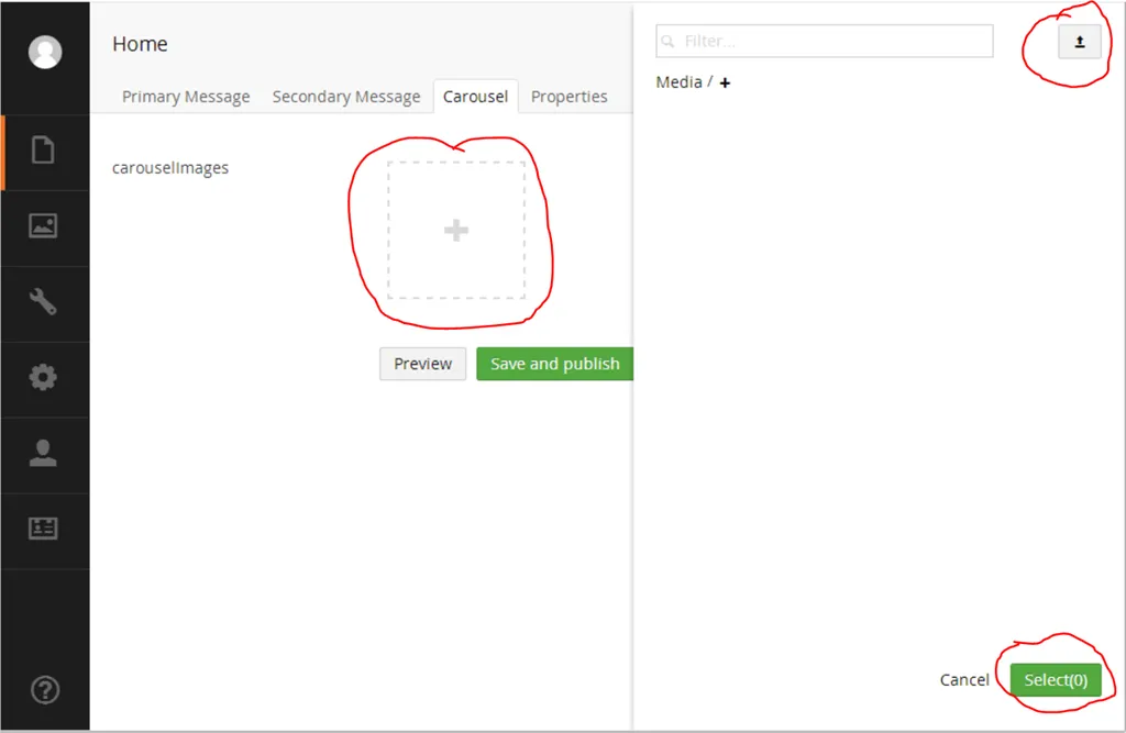 To get the carousel in action we need to upload images and publish them. Go to Content → Home → Carousel tab to open properties for the Home page as shown in figure 1 below.