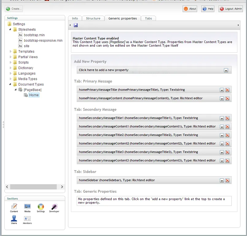 Now we need to define the Home Page document type, expand the Document Types node under Settings. Right click on the [PageBase] node and select Create from the context menu. Provide the document name as Home and uncheck the Create Matching template checkbox and click Create button to create the Home document type under the [PageBase] document. We create it under the [PageBase] document so that it can inherit properties defined in the base document. Switch to the Structure tab and select Yes for Allow at root so that Home page can be the root of the site. Save the setting and switch to the Tabs tab so that we can define the tabs required for the Homepage. Add 3 new tabs named Primary Message, Secondary Message and Sidebar by entering the tab name and clicking New Tab button. Switch to the Generic Properties tab and add the following properties.