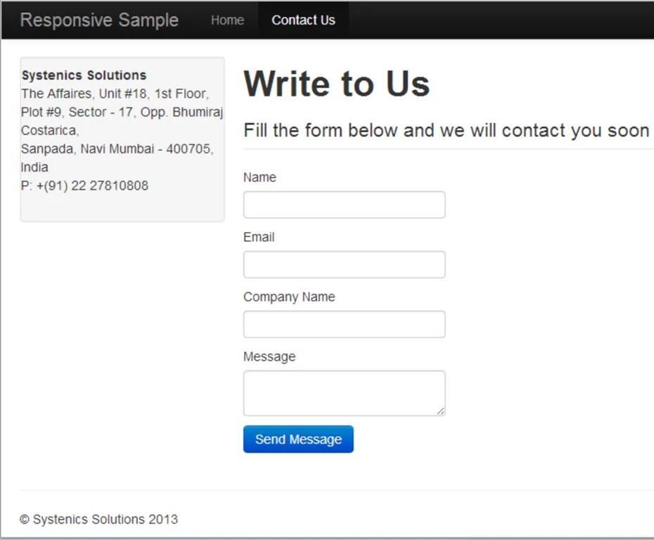 In the above Listing 7 we have defined a variable contact which is an instance of our model class and is used to pass the model to the partial view. We have also used Bootstrap formatting and divided the page into two major areas one having the contactUsContactInformation Umbraco field and another including our ContactForm partial view.