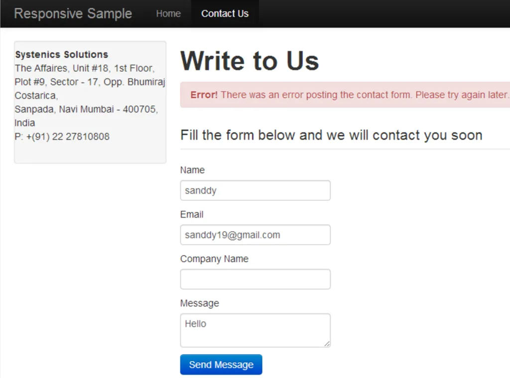 You can see from the code above that our partial view inherits from the generic Umbraco.Web.Mvc.UmbracoViewPage<T> class which is instantiated to our MVCUmbraco.Models.Contact class type. We do this so that our Model class is available as a model in our partial view. Next we use Ajax.BeginForm helper to define our Ajax enabled form, just like we use in normal ASP.NET MVC 4 forms. We pass the action and controller name as parameters, make sure you have them correctly defined else your form will keep giving all kinds of errors. We also pass an AjaxOptions object to the helper and define that we want to replace the contents of the target div upon success of the form. We also hook up the OnFailure and OnSuccess client side events to appropriate JavaScript methods. We then define the the MVC controls for the Model. You will note that the form has been styled as per Bootstrap guidelines. The ShowError and ShowSuccess JavaScript methods use appropriate Bootstrap classes to display styled alerts.