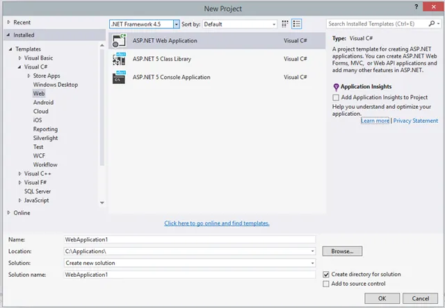 Fire up Visual Studio 2015 Preview and click File menu –> Add new Project to bring up the New Project Dialog. Select the ASP.NET Web Application template under Visual C# –> Web as shown in figure 1 below.
