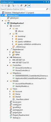 Once the new ASP.NET 5 Web application project is created lets look at the Solution Explorer window to get a better idea of the different components of the new project template.
